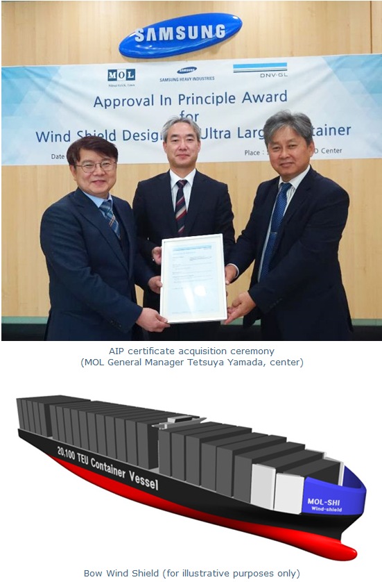 Proceeding development of new technology reduced environmental impact Tokyo - November 14, 2019 Mitsui O.S.K. Lines, Ltd. (MOL; President & CEO: Junichiro Ikeda) today announced that, DNVGL (headquarters: Germany) issued an Approval In Principle (AIP) to MOL and Samsung Heavy Industries, Co., Ltd. (SHI; President and CEO: Joon Ou Nam; headquarters: Seoul, South Korea) for Bow Wind-Shield designed for Ultra-Large Container Carrier on 30th October, 2019. This newly developed Bow Wind-Shield reduces the wind resistance on hull body of while ship is running, and it is expected CO2 reduction up to about 2–4% owing to optimal design for Ultra-Large Container Carrier. This is based on the technology of both company MOL and SHI. MOL has developed and installed bow wind shield on exiting middle-size containership in 2015(note1), and confirmed CO2 reduction by about 2% in real-running condition in 2017(note2). SHI also has developed bow wind shield for Ultra-large Container Carrier. Introducing both companies' technology, MOL and SHI have started joint-development project for the optimal Bow Wind-Shield design for Ultra-Large Container Ship and achieved to significant level of effect and established practical structure of Bow Wind-Shield whose technology has been certified as AIP from DNVGL this time. MOL continually drive ahead with its "ISHIN NEXT - MOL SMART SHIP PROJECT -," develops and introduces new technologies that will reduce vessels' environmental impact and ensure safe operation, and offers safe, reliable transport services.