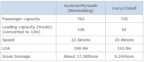 Large Ferries Reduce Environmental Impact with Cutting-edge Technology and Compliance with Modal Shift, While Inheriting a Proud Tradition of Service Tokyo - November 20, 2019 Mitsui O.S.K. Lines, Ltd. Ferry Sunflower Limited Mitsui O.S.K. Lines, Ltd. (MOL; President & CEO: Junichiro Ikeda) and its group company Ferry Sunflower Limited (President: Mitsujiro Akasaka; Head Office: Oita-shi, Oita Prefecture) today announced plans to construct the first two LNG-fueled ferries in Japan, the Sunflower Kurenai and the Sunflower Murasaki (Vessel names are tentative). MOL plans to order the vessels from Mitsubishi Shipbuilding Co., Ltd. (President: Koji Okura; headquarters: Nishi-ku, Yokohama-shi) in December. Ferry Sunflower will charter the ferries after delivery and launch them on its Osaka-Beppu route from the end of 2022 through the first half of 2023, as replacements for vessels currently in service (Note 1). Reduced environmental impact The ferries will be equipped with high-performance dual fuel engines (Note 2) and will provide passengers with comfortable accommodations and reliable schedules. What's more, they will be quieter than current vessels, ensuring smoother, more relaxing travel. The use of LNG fuel will achieve excellent environmental performance, reducing carbon dioxide (CO2) emissions by 20% compared to current vessels, and virtually eliminating sulfur oxides emissions. Compliance with Modal Shift Please refer to the comparison between the Sunflower Ivory and the Sunflower Cobalt currently in service.