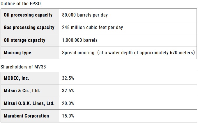 January 30, 2020 MODEC, Inc. Mitsui & Co., Ltd. Mitsui O.S.K. Lines, Ltd. Marubeni Corporation MODEC, Inc. ("MODEC," head office: Chuo-ku, Tokyo; President & CEO: Yuji Kozai), Mitsui & Co., Ltd. ("Mitsui," head office: Chiyoda-ku, Tokyo; President & CEO: Tatsuo Yasunaga), Mitsui O.S.K. Lines, Ltd. ("MOL," head office: Minato-ku, Tokyo; President & CEO: Junichiro Ikeda) and Marubeni Corporation ("Marubeni," head office: Chuo-ku, Tokyo; President & CEO: Masumi Kakinoki) have agreed that Mitsui, MOL and Marubeni will invest in a long-term charter business ("the Project") currently promoted by MODEC for the purpose of providing a floating production, storage, and offloading system ("the FPSO") for use in the Marlim field off the coast of Brazil. The above four companies ("the Companies") have entered into related agreements on 30th January 2020. Based on these agreements, Mitsui, MOL and Marubeni will invest in Marlim1 MV33 B.V. ("MV33"), a Dutch company established by MODEC, and the Companies will proceed with the Project jointly. MV33 has received a Letter of Intent for a long-term charter agreement for the deployment of the FPSO in October 2019 from PetrĂ³leo Brasileiro S.A. (Petrobras), the Brazilian state oil company. The FPSO will be chartered for 25 years under this charter agreement. The FPSO will be named FPSO Anita Garibaldi MV33 and will be deployed at the Marlim field situated in the Campos Basin. The field is located approximately 150 kilometers from Rio de Janeiro, in the southeast coast of Brazil. FPSO will be moored in approximately 670 meters water depth, in the year of 2022. The Project is the eighth occasion under which the Companies have collaborated to operate FPSOs in Brazil.