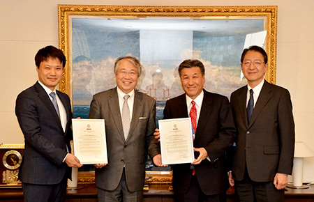 AIP certificate acquisition (from right: MOL Nakano Executive Officer, Kawagoe Senior Managing Executive Officer)