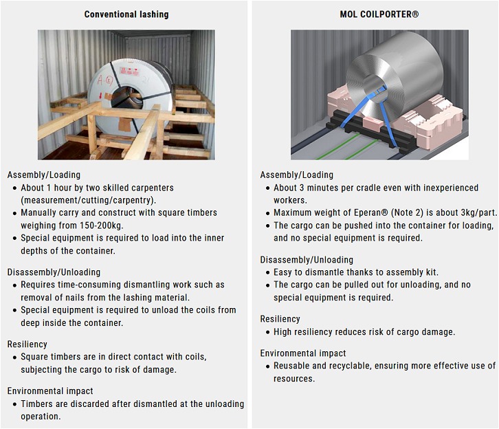 Future Endeavors The MOL Group is striving to expand its NVOCC business under the group's unified brand MOL Worldwide Logistics (MWL). MOL Logistics engages in sales under MWL in Japan. To meet customer demand, starting in Japan, MOL Logistics will commence service using the MOL COILPORTER® as a differentiated product in May 2020 as part of its door-to-door NVOCC service. In addition, the MOL COILPORTER® has acquired the approval (Note 3) of Ocean Network Express Pte. Ltd. (ONE; MOL's investment ratio: 31%) for comprehensive transportation services, based on trial shipments with ONE. MOL will offer new value in containerized steel coil transport through MOL COILPORTER® and continually develops logistics products that offer stress-free services to customers. (Note 1) The claims of JP Patent No. 2017-230685/ 2019-018608/2019-031874/2020-008416/2020-052603 (Note 2) Registered trademark of Kaneka Corporation. Foamed polyethylene developed by Kaneka. The material has excellent cushioning properties and resiliency and is lightweight. (Note 3) The approval for comprehensive transportation services is on the assumption of transport standards independently established by ONE. Mitsui O.S.K. Lines, Ltd. press release