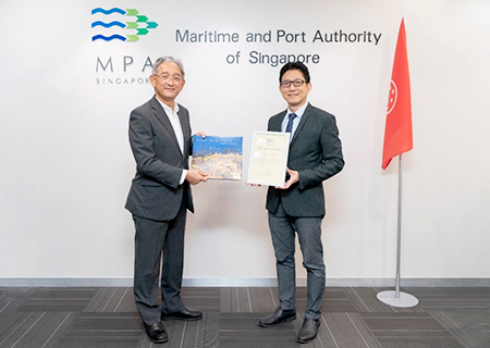 MOL Executive Officer and MOL (Asia Oceania) Pte. Ltd. Managing Director Koichi Yashima, left, and MPA Director of Shipping Goh Chung Hun. Image by MOL Mitsui O.S.K. Lines, Ltd. press release