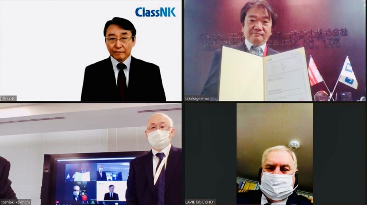 Online Certificate Delivery Ceremony (Top left: Yoshinori Kozeki, Corporate Officer, ClassNK.; Top right: Takakage Imai, President, MOL Ship Management Co., Ltd.; Bottom left: Satoshi Fujii, General Manager, Mitsui O.S.K. Lines, Ltd.; Bottom right: Master of M/V "Orca Ace", Capt. Sergey Nichiporenko) (Note 1) Scope of the remote survey conforms to ClassNK regulations. (Note 2) Please refer to April 3, 2017 press release: Participation in the MLIT R&D Support Projects - Proactive ICT Utilization for Safer Vessel Operation - (Note 3) ICT stands for Information and Communication Technology, which adds the dimension of telecommunications to Information Technology (IT). Mitsui O.S.K. Lines, Ltd. press release