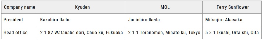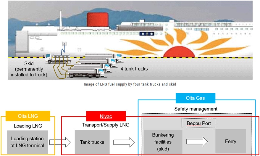 LNG fuel supply is slated to begin around the end of 2022 upon the delivery of the ferries, which are now under construction. Around 50 tons of LNG fuel per day will be supplied via truck-to-ship* to these ferries berthed in Beppu Port (the northside wharf at the third pier) in Oita Prefecture. To speed up the fuel supply process, pipes called "skid" will be connected to four tank trucks, allowing them to fuel the vessels simultaneously. * One of the methods to supply LNG to vessels. LNG is supplied to the vessel at berth from tank trucks parked on the wharf. LNG fuel will be supplied to the tank trucks at the loading station of Kyuden Group company Oita Liquefied Natural Gas Company, Inc. (Oita LNG). Niyac Corporation (Niyac) will transport and supply LNG to the ferries and Oita Gas Co., Ltd. (Oita Gas) will oversee safety during LNG bunkering. Meanwhile, Kyuden will sell LNG fuel to Ferry Sunflower through MOL Group company MOL Techno-Trade, Ltd.. This system will link a series of well-prepared measures from loading to transport and supply and achieve a safe and reliable supply of LNG fuel. MOL, Ferry Sunflower, and Kyuden view this project as an effective means of reducing the carbon emission of vessel operation as global environmental regulations have become stricter. They will take a proactive stance in promoting the introduction of eco-friendly LNG to help realize a low-carbon society.