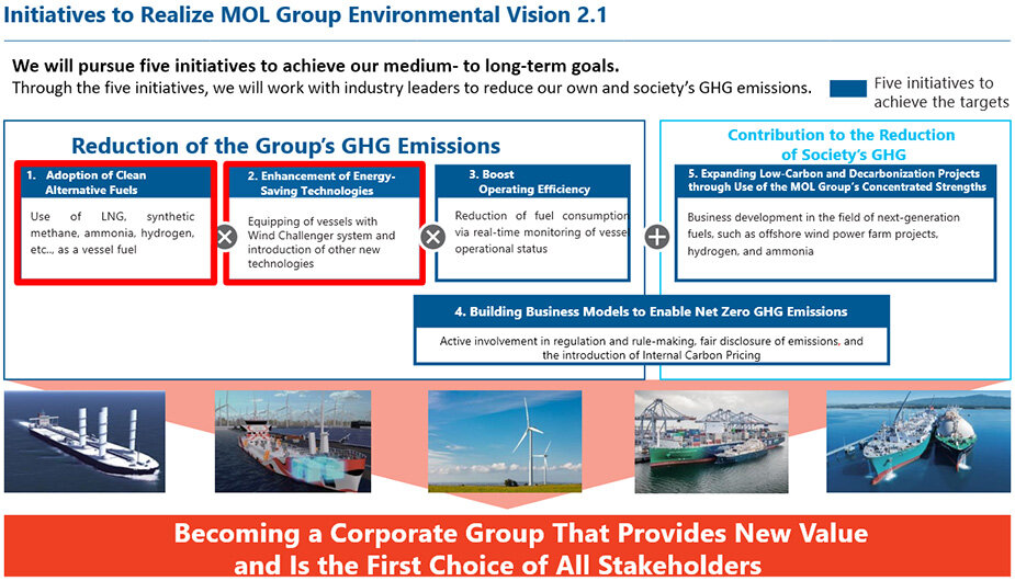 MOL will partner with Tata Steel on this innovative project to reduce greenhouse gas emissions in its supply chain. Peeyush Gupta, Vice President, Supply Chain, Tata Steel, said: "The objective of the agreement is to reduce greenhouse gas (GHG) emissions in the ocean transportation of raw materials for production of steel. In the initial stage, the partnership will explore the environmental benefits and commercial and operational feasibilities of various technologies. This will include the, "Wind Challenger (Note 1) ", a hard sail, which would reduce emissions by harnessing wind energy. MOL has been jointly studying the technology with cross-industrial partners and the first vessel to be equipped with the Wind Challenger is slated to start operation in 2022." Ranjan Sinha, Chief Group Shipping and Director RM Procurement of Tata Steel, said: "Tata Steel as a signatory of Responsible Steel is committed to aligning its shipping activities with responsible environmental behaviour. We are pleased to be joining hands with MOL, a reputed global marine transport company, in combining efforts towards sustainable shipping." Toshiaki Tanaka, Senior Managing Executive Officer and Chief Environment and Sustainability Officer of MOL, said: "We have recently established MOL Group Environmental Vision 2.1 (Note 2), where we announced that MOL Group will make a concerted effort throughout the Group to achieve net zero GHG emissions by 2050. Including this opportunity, we will pursue "Adoption of Clean Alternative Fuels" and "Enhancement of Energy-Saving Technologies" more in the five initiatives (Fig. 1) to achieve the goal. There would be a long, long pathway to achieve the Vison 2.1, and we believe that working collaboratively with a good partner is important. The partnership with Tata Steel, a leading global steel company, encourages MOL to challenge goals for the Vision 2.1. We are very much happy to have this opportunity." About Tata Steel Tata Steel group is among the top global steel companies with an annual crude steel capacity of 34 million tonnes per annum. It is one of the world's most geographically diversified steel producers, with operations and commercial presence across the world. The group recorded a consolidated turnover of US $21.06 billion in the financial year ending March 31, 2021. A Great Place to Work-CertifiedTM organisation, Tata Steel Ltd., together with its subsidiaries, associates, and joint ventures, is spread across five continents with an employee base of over 65,000. Tata Steel has been a part of the DJSI Emerging Markets Index since 2012 and has been consistently ranked amongst top 5 steel companies in the DJSI Corporate Sustainability Assessment since 2016. Besides being a member of ResponsibleSteelTM and worldsteel's Climate Action Programme, Tata Steel has won several awards and recognitions including the World Economic Forum's Global Lighthouse recognition for its Jamshedpur, Kalinganagar and IJmuiden Plants, and Prime Minister's Trophy for the best performing integrated steel plant for 2016-17. The Company, ranked as India's most valuable Metals & Mining brand by Brand Finance, featured amongst CII Top 25 innovative Indian Companies in 2020, received rating of 'A-' (leadership band) from CDP for its Climate Change disclosure and Supply Chain disclosure, Steel Sustainability Champion 2020 recognition from worldsteel, 'Most Ethical Company' award 2021 from Ethisphere Institute, Best Risk Management Framework & Systems Award (2020) from CNBC TV-18, and Award for Excellence in Financial Reporting FY20 from ICAI, among several others. To know more, visit www.tatasteel.com and www.wealsomaketomorrow.com. About Mitsui O.S.K. Lines, Ltd. and MOL Drybulk Ltd. Mitsui O.S.K. Lines, Ltd. (MOL), as a global marine transport group, operates a global fleet exceeding 700 vessels, including tankers, bulkers, car carriers, ferries, which also extends to offshore projects. Under the "MOL Group Environmental Vision 2.1" announced in June 2021, MOL clarifies its commitment to achieve net zero GHG emissions by 2050 through collective efforts with all capabilities within the group. MOL Drybulk has been established since April 2021 as a unique entity operating vessels ranging from 10,000DWT up to 100,000DWT bulk carriers, wood chip carriers and multi-purpose vessels, with the aim to provide a "one-stop service" to the customers, work collaboratively to meet their needs and provide environmental solutions to reduce the GHG emissions throughout the supply chain. (Note 1) Wind Challenger Project Concept video: "For the future of the planet, We challenge with the Wind" Wind Challenger Project - MOL - YouTube This has the potential to achieve 5% to 8% reduction in GHG emissions by reducing bunker oil consumption through the use installation of a telescoping hard sail that converts wind energy to propulsive force. (Please refer to October 3, 2019, press release: "Wind Challenger" Design Acquires Preliminary Approval - Realizing Japan's 1st Large Cargo Ship with 'Sail', Aiming at Reduction of GHGs -) MOL has already placed an order with Oshima Shipbuilding for construction of the first vessel to be equipped with the Wind Challenger-a coal carrier, slated to start operation in 2022 supplying Tohoku Electric Power Co.,Inc. (Please refer to December 10, 2020, press release: MOL, Tohoku Electric Power Sign Deal for Transport Using Coal Carrier Equipped with Hard Sail Wind Power Propulsion System (Wind Challenger) -Aiming to Reduce Environmental Impact and Boost Economic Efficiency by Introducing World's 1st Coal Carrier Equipped with a 'Sail'-) (Note 2) MOL Group Environmental Vision 2.1 MOL Group Environmental Vision 2.1 | Environment | Sustainability | Mitsui O.S.K. Lines (disclosure.site) (Fig. 1)