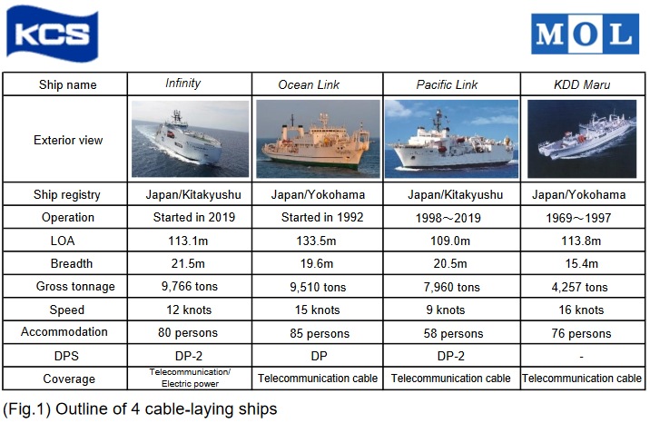 KCS was established in 1966 and the following year launched the KDD Maru, Japan's first submarine cable-laying ship. Over the ensuing half century, the company has been involved in the construction of some 70,000km of undersea cables, mainly in the Asia-Pacific region. It is a leading company in submarine cable-laying and maintenance, and oversees the maintenance of over 87,000km of cable. In 2019, KCS launched the KDDI Cable Infinity, Japan's first self-propelled power and telecommunication cable-laying ship. MOL and its group company MOL Marine & Engineering Co., Ltd. (MOLMEC) have managed and operated a total of four (Fig.1) KCS-owned cable-laying ships including the KDD Maru for over 50 years. The MOL Group is the only Japanese ocean shipping company involved in the management and operation of cable-laying ships. Cable-laying ships adopt "Dynamic Positioning Systems" to lay submarine cables with safety and precision, and MOL and MOLMEC have accumulated technology and expertise to automatically maintain the ship position under various environmental and weather conditions. Their collective know-how and skilled personnel are expected to be used in a wide range of various offshore businesses, including the rapidly growing wind power generation field. KCS is responsible for cable handling and laying operations, which require advanced technology, expertise, and knowledge, while MOL and MOLMEC are in charge of ship management and operation including supplying seafarers who have the advanced skills to operate the "Dynamic Positioning Systems" indispensable for cable-laying ships. As they fulfill these roles, both companies will jointly research commercial opportunities in new submarine cable-laying demand, mainly for offshore wind farm facilities, which are gaining wider application in Japan and throughout Asia.