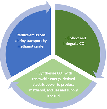 Innovative Low-emission Vessel Can Adjust Combustion Temperature To Reduce NOx by Mixing Water into Methanol Fuel Tokyo - November 05, 2021 Mitsui O.S.K. Lines, Ltd. (MOL; President & CEO: Takeshi Hashimoto; Headquarters: Minato-ku, Tokyo) today announced that on November 4, the methanol carrier "Capilano Sun", which can run on either heavy oil or low-environmental impact methanol fuel, was delivered at Hyundai Mipo Dockyard (President: H.D. Shin; Headquarters: Ulsan, South Korea). The vessel will be chartered from Hisafuku Kisen K.K. (President: Chikashi Yamane; Headquarters: Onomichi-shi, Hiroshima), and Waterfront Shipping Company Limited (WFS; President: Paul Hexter; Headquarters: Vancouver, Canada) will charter the vessel from MOL under a long-term contract. MOL is one of the largest operators for methanol carriers, operating 18 vessels (including "Capilano Sun"), and in 2016, started owning and operating dual-fuel vessels that can run on environment-friendly methanol fuel, continuously expanding the fleet. Currently, MOL operates 4 of the 13 methanol dual-fuel tankers in service around the world. These methanol dual-fuel vessels can reduce emissions of sulfur oxide (SOx) by up to 99%, particulate matter (PM) by up to 95%, nitrogen oxide (NOx) by up to 80%, and carbon dioxide (CO2) by up to 15%, compared to vessels using conventional fuel oil. The "Capilano Sun" is the most advanced low-emission vessel , which adopts advanced technology that adjusts the combustion temperature by mixing water into methanol fuel and can meet Tier 3 NOx regulations (Note 1) without a scrubber. In the future, duel fuel methanol carriers can become an Environmental circulation-type business, by synthesizing the carbon dioxide from carbon capture methods, CO2 Carrries, with Hydrgen derived from renewable resource based electricity such as offshore wind power and wave power, which MOL looks into. The Methanol produced from the cycle can be used or provided as fuel, which will reduce the net CO2 emission. (Refer to figure on the left.) MOL's approach to environmental issues is guided by the "MOL Group Environmental Vision 2.1" (Note 2), further expanding its methanol transport services by meeting a broad range of customer needs and leveraging its accumulated experience and know-how as the owner of one of the world's largest methanol carrier fleets. MOL also takes a proactive approach to adopting various technologies that help reduce the environmental impact of its business activities. (Fig. 1) Please refer to our previous press releases in relation with WFS (Note 3). "Environmental Circulation-type Methanol Carrier Business"