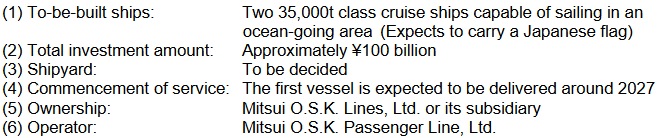 Cruise Ships Tokyo - November 25, 2022 Mitsui O.S.K. Lines, Ltd. (the Company; President & CEO: Takeshi Hashimoto) hereby announces that the Board of Directors today decided on a plan to build two new ocean-going cruise ships. Details of the announcement are as follows. 1. Overview of to-be-built cruise ships