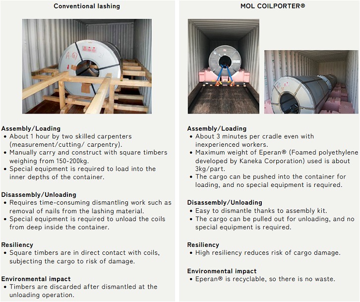 Tokyo - March 16, 2023 Mitsui O.S.K. Lines, Ltd. (MOL; President & CEO: Takeshi Hashimoto) today announced that on March 14 in Seoul, Korea, its wholly owned subsidiary in Hong Kong, MOL Hong Kong Limited (MOLHK) signed a lease agreement with YALE GLS Logistics (YALE; CEO: Hyungdo Cha), a logistics company in Seoul, Korea, for the MOL COILPORTER® (see video and overview below), an innovative system for lashing steel coils during containerized transport of steel coils, jointly developed by MOL and its group companies. Video of MOL COILPORTER Video by MOL. Outline of MOL COILPORTER® The MOL COILPORTER®is the new cradle used to lash steel coils, an essential material for automobile manufacturing and other industries, to ensure safer containerized transport. Differences from the conventional lashing are as follows.