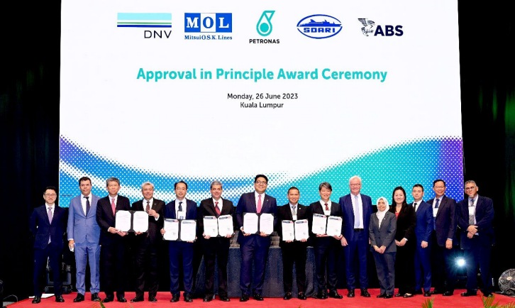 The presentation ceremony took place on June 26 at the Kuala Lumpur Convention Centre, the venue of Energy Asia*2, an international conference to promote sustainable development of the energy industry aimed at achieving net zero emissions in Asia. Under a memorandum of understanding (MoU) signed on February 7, 2022*3, MOL and PETRONAS have jointly studied the optimum means of ocean transport for LCO2 within the Asia Pacific and Oceania region and, in cooperation with SDARI, completed the concept study of LCO2 carriers and FSO. An FSO is a floating facility that can receive, store, and offload cargo offshore, and LCO2 FSOs are considered one of the most effective scenarios in the carbon capture, utilization, and storage (CCUS) market. Completion of these concept designs and acquisition of AiPs clears the way toward a flexible approach to transport needs in consideration of volume, transport distance, and direct transport to FSOs near offshore storage facilities. MOL Senior Managing Executive Officer Nobuo Shiotsu said, "MOL is pleased with our achievement of the various designs of the LCO2 carrier and FSO in cooperation with PETRONAS and SDARI. Development on a large scale is an essential step for the CCUS value chain within the Asia Pacific and Oceania region. Through the newly acquired AiP, the MOL Group will further accelerate this initiative on the CO2 transport business to contribute to reducing society's overall GHG emissions." Upstream PETRONAS Executive Vice President and Chief Executive Officer Adif Zulkifli said, "LCO2 carriers for CO2 transportation play a key role in the carbon capture and storage value chain. The acquisition of the AiPs further strengthens PETRONAS' commitment in offering decarbonization solutions, aligned with our aspiration in establishing Malaysia as a leading CCS hub in the region." "SDARI is delighted to join the innovative project with PETRONAS and MOL. The concepts will be essential to LCO2 transportation and operation, and will boost CCUS development in the maritime industry. The acquisition of the AiPs is the new start and SDARI will continuously provide more and more innovative solutions to partners for the ambitious decarbonization plan." said SDARI Vice President Zhou Zhiyong.