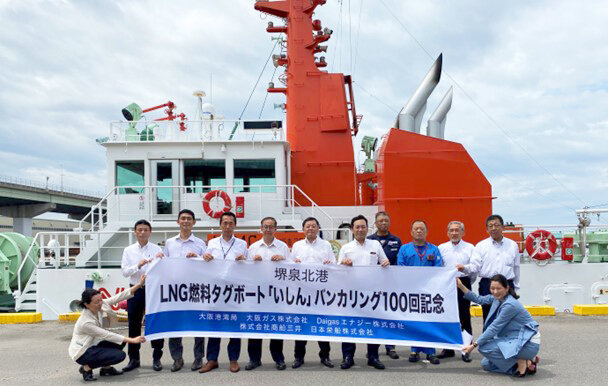 Tokyo - July 12, 2023 Mitsui O.S.K. Lines, Ltd. (MOL; President & CEO: Takeshi Hashimoto) today announced that the LNG-fueled tugboat Ishin, owned by MOL and operated by its group company Nihon Tug-Boat Co., Ltd. (President: Keizo Tamura; Headquarters: Chuo-ku, Kobe), has marked its 100th LNG bunkering at the Port of Sakai-Semboku, Osaka, after entering service in 2019. A ceremony to celebrate this milestone was held at the Port of Sakai Semboku, and a commemorative plaque was presented by the Osaka Ports and Harbors Bureau (Director: Junya Maruyama; Headquarters: Suminoe-ku, Osaka City). The Ishin is currently engaged in harbor towage and escort operations for large freighters and other vessels mainly in the Port of Sakai-Semboku. It receives carbon neutral LNG from Osaka Gas Co., Ltd. (President: Masataka Fujiwara; Headquarters: Chuo-ku, Osaka) and Daigas Energy Co., Ltd. (President: Masayuki Inoue; Headquarters: Chuo-ku, Osaka) by the truck-to-ship system using LNG trucks. The MOL Group has moved forward with the "adoption of clean alternative energy" strategy toward de-carbonization/low carbonization in line with "MOL Group Environmental Vision 2.2," with the aim of achieving net zero greenhouse gas (GHG) emissions by 2050. It will further expand the introduction of LNG-fueled vessels as an initiative that can be taken now, and accelerate our efforts to reduce total GHG emissions.