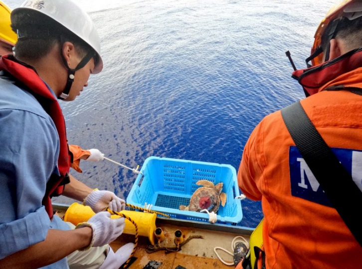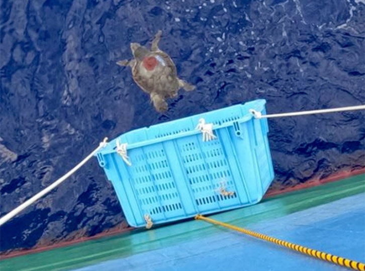 Tokyo - July 14, 2023 Mitsui O.S.K. Lines, Ltd. (MOL; President & CEO: Takeshi Hashimoto) today announced that one of its car carriers, the Galaxy Ace, teamed up with Port of Nagoya Public Aquarium on a project to study the migration patterns of loggerhead turtles (Note 1), with the vessel transporting turtles and aquarium staff. On June 27, 25 loggerhead turtles were loaded onto the vessel at the Kinjo Pier in the Port of Nagoya, and on July 11 (local time), two research team members aboard the vessel released them into the Pacific Ocean.