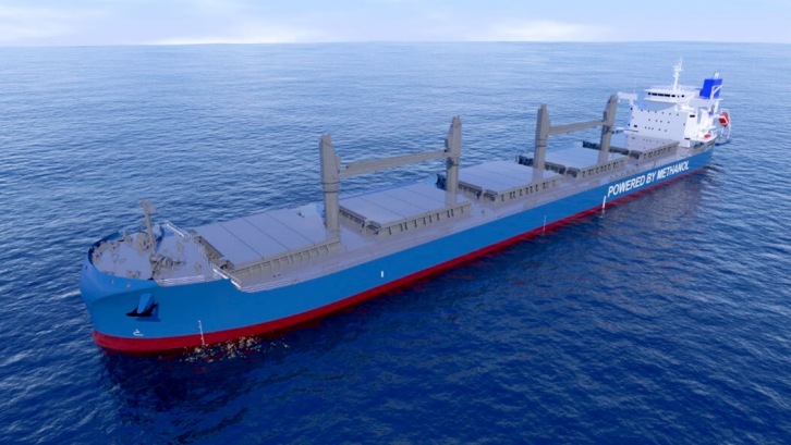 CG rendering of the newbuilding methanol dual fuel bulk carrier. Image by MOL. (Note 1) The vessel will feature a dual-fuel combustion main engine that can run on methanol, or heavy oil as a backup fuel. (Note 2) On a life-cycle basis from fuel production to consumption.
