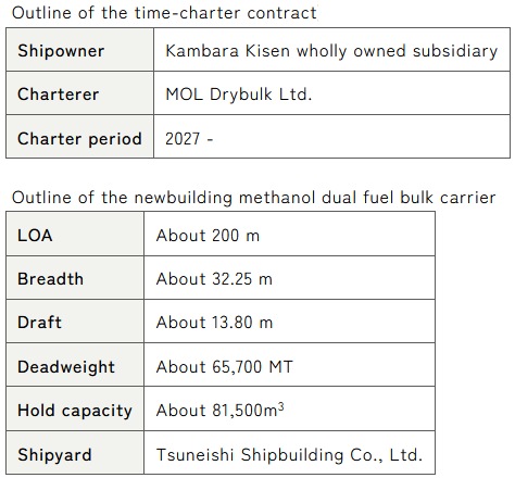 The vessel is designed to use e-methanol produced primarily by synthesizing recovered CO2 and hydrogen produced using renewable energy sources, and bio-methanol derived from biogas. The use of methanol derived from non-fossil raw materials significantly reduces GHG emissions(Note 2), compared to heavy oil-fueled and similar-size conventional vessels. The vessel's design maximizes cargo space while ensuring sufficient methanol tank capacity set to allow the required navigational distance assuming various routes, at the same time maximizing cargo space. The vessel is expected to serve mainly in the transport of biomass fuels from the east coast of North America to Europe and the U.K. and within the Pacific region, as well as grain from the east coast of South America and the U.S. Gulf Coast to Europe and the Far East. MOL has established the "MOL Group Environmental Vision 2.2" and set the goal of achieving net zero greenhouse gas (GHG) emissions by 2050. One of the key strategies to achieve this goal includes the "adoption of clean alternative fuels," and MOL Group aims to have 90 LNG/methanol-fueled vessels in service by 2030. In addition, with growing worldwide interest in methanol fuel as a promising clean energy source, it will promote its initiatives to secure the necessary capacity, not only in terms of fleet planning of methanol dual fuel vessels, but also in procurement of low and decarbonized methanol fuel. MOL Group and Kambara Kisen that introduce the methanol dual fuel bulk carriers at an early stage, will play a role in initiatives by society as a whole to achieve decarbonization through safe ownership, management, and operation of this innovative vessels.