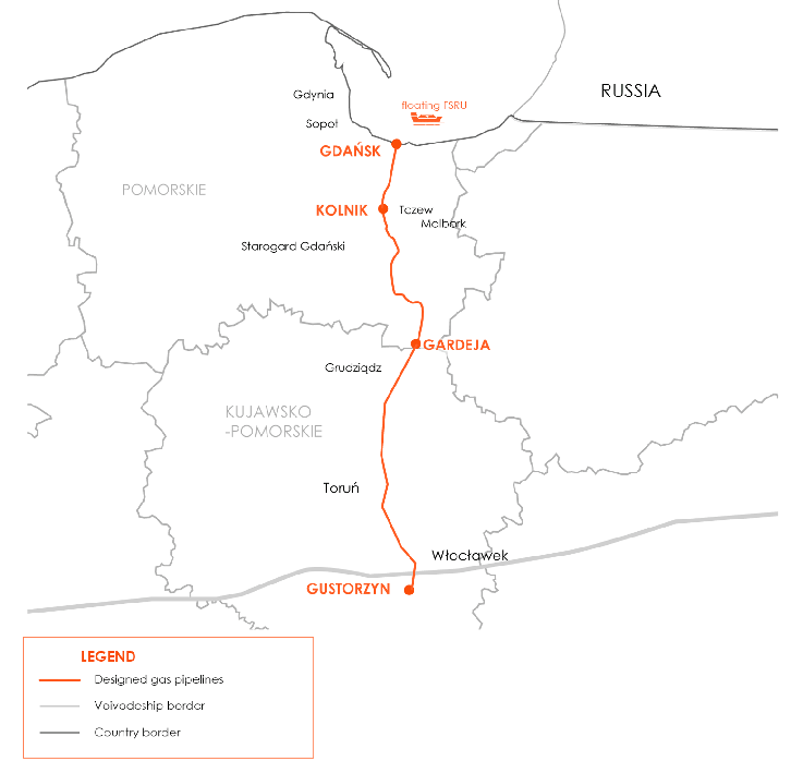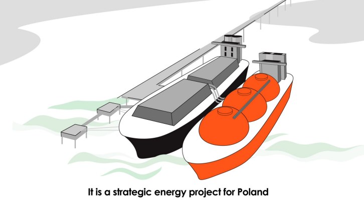 (Left: FSRU, right: LNG carrier) Courtesy of GAZ-SYSTEM This is Poland's first such FSRU and is a strategically important piece of energy infrastructure which will enhance the country's energy security. The FSRU is assumed to be berthed at a mooring platform approximately 3km from the shore, in the area of the Port of Gdansk between the mouths of the Vistula River branches: Śmiała and Martwa. As part of the project, the necessary offshore and onshore infrastructure will also be constructed. Commissioning of the complete project is planned in 2027/2028.