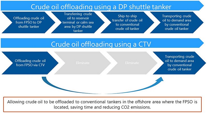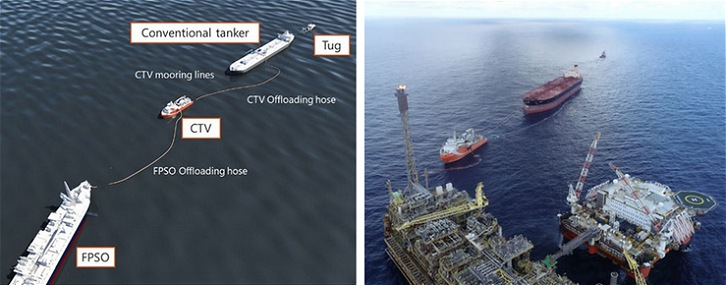 SeaLoading started a CTV agreement with Petrobras for SeaLoader 2 on a trial period in January 2022, and successfully completed more than 30 crude oil offloading operations from Petrobras' FPSOs located in the Santos Basin, Brazil, transferring the cargo to tankers - the trials involved vessels up to VLCC size. After the successful conclusion of the trial agreement, proving the CTV technology efficiency and reliability, the vessel was placed on a time charter contract in 2023 with Petrobras. Now SeaLoading has signed a memorandum of understanding (MoU) with Petrobras to start the negotiations for a newbuilding CTV by the end of 2024. The crude oil produced from offshore fields by a floating production, storage & offloading system (FPSO)(Note 2) is usually transported to the demand area via crude oil tankers, which, in most cases, requires DP shuttle tankers(Note 3) with special cargo handling equipment firstly receive the crude oil and transport it to an oil storage terminal or calm waters where it can be offloaded (or transshipped), and then reloaded onto a crude oil tanker. In the case of CTV, the crude oil can be directly loaded from the FPSO to the crude oil tanker by connecting a CTV between an FPSO and the crude oil tanker. This dramatically increases the efficiency of crude oil logistics. Currently, there are only 2 two CTVs in the world, all owned by SeaLoading, which holds the patent for the CTV technology.