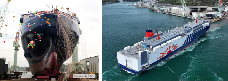 Tokyo - April 11, 2024 Mitsui O.S.K. Lines, Ltd. (MOL; President & CEO: Takeshi Hashimoto) and its group company MOL Sunflower Ltd. (MOL Sunflower; President & CEO: Hirotoshi Ushioku; Headquarters: Chiyoda-ku, Tokyo) today announced that the naming and launching ceremony for the first of two LNG-fueled ferries, which are under construction at Naikai Zosen Corporation (President: Kosaku Hara; Headquarters: Onomichi-shi, Hiroshima Prefecture), was held at Innoshima Shipyard on April 11. The vessel was given its name Sunflower Kamuy by Tomoyasu Marutani, Chairman of Secoma Company Limited, and then his wife, Michiko Marutani, performed the ceremonial rope cutting. The vessel will be delivered at Naikai Shipbuilding in December 2024 and is slated to enter service on the late-night Oarai-Tomakomai route operated by MOL Sunflower in early 2025. The second of the two new vessels is scheduled to enter service on the same route within 2025. With the addition of these vessels, the MOL Group will operate a fleet of four LNG-fueled ferries on east-west routes in Japan by 2025, joining the Sunflower Kurenai and Sunflower Murasaki, which went into service on the Osaka-Beppu route in 2023. Video by MOL. About the Sunflower Kamuy Origin of the ship's name