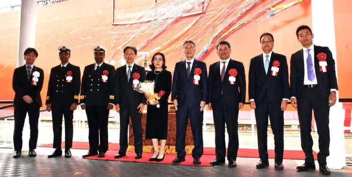 The Aquamarine Progress II will sail under a time charter contract with GYXIS Corporation (President and Representative Director: Keiji Tanaka; Head Office: Minato-ku, Tokyo), a Japanese LPG importer and distributor. The dual-fuel vessel can run on either LPG or conventional heavy oil, and when LPG is used as fuel, CO2 emissions can be reduced by about 20% and sulfur oxides (SOx,) particulate matter (PM), and so on. by about 90% compared to heavy oil. In addition, the specifications allow for the transport of ammonia as well as LPG. Ammonia, which emits no carbon dioxide during combustion, is expected to increase in demand in the future as a next-generation clean energy source. The naming ceremony was held on March 12 at the Imari Works of Namura Shipbuilding, and the vessel was named by GYXIS President and Representative Director Keiji Tanaka. Along with GYXIS, MOL will further contribute to the stable supply of LPG to Japan through the operation of the Aquamarine Progress II. The MOL Group has positioned environmental strategy as a key element in its "BLUE ACTION 2035" management plan, and has set the target of achieving net zero greenhouse gas (GHG) emissions by 2050 in the "MOL Group Environmental Vision 2.2." The group will continue working together to achieve net zero GHG emissions by 2050 through concerted group-wide efforts.