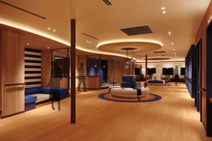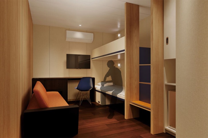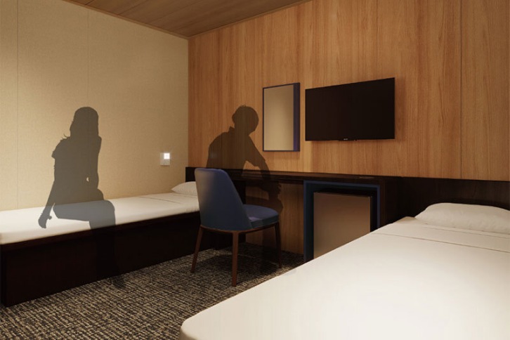 Passenger room (Comfort S Twin). Image by MOL. The MOL Group aims to achieve net-zero GHG emissions by 2050, and in line with the "MOL Group Environmental Vision 2.2," the group will continue to pursue a strategy of adopting clean alternative fuels to achieve decarbonization and low carbon emissions. The group not only leads the way in environmental responsiveness in the coastal ferry business, but also continues to research and study the use of new fuels as alternatives to LNG in the future, intending to be the first in the industry to take a proactive approach. (Note 1) The ship design features a shape that reduces wind pressure from the bow and the sides, jointly developed by MOL, MOL Techno-Trade, Ltd., Akishima Laboratories (Mitsui Zosen) Inc. It smooths out the wind flow and uses lift force received from diagonal headwinds to help propel the ship. This utilizes the characteristics of ferries operating at high speed. Mitsui O.S.K. Lines, Ltd. press release