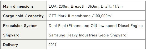 Since becoming the first company in the world to enter the VLEC business in 2014(Note 2), MOL group has steadily built up a solid track record in liquefied ethane transport and a reputation as a leading company in VLEC management and operation, gaining a high level of trust from customers. SCGC, meanwhile has decided to import ethane to enhance its competitiveness through lower feedstock cost and flexibility for Long Son Petrochemicals Co. Ltd. (LSP), which is one of the largest and most state-of-the-art petrochemical plants of SCGC while also lowering carbon emissions. In securing the ethane transport vessels, SCGC recognized MOL group's performance in the VLEC business, and has selected MOL group as a VLEC service provider, leading up to the long-term charter contract. MOL group expects to strengthen SCGC's competitiveness in the petrochemical industry in Vietnam, and contribute to the growth of regional economies, by taking on the responsibility of transporting liquefied ethane for SCGC. To meet the expected increase in demand for ethane transportation, we will continue to expand our VLEC business. We will provide safe and reliable maritime transportation services utilizing our advanced safety management system, which has been cultivated through LNG transportation and other liquefied gas operations. By doing so, we will contribute to the development of the regional economy and achieve the accumulation of long-term stable profits as outlined in our group management plan "BLUE ACTION 2035." (Note 1) VLEC is a ship with a carrying capacity of approximately 80,000m3 or more and is dedicated to transporting liquefied ethane at about minus 92 degrees Celsius. Ethane is the second most abundant component of natural gas after methane. Ethane accounts for about 5~20% of natural gas, although its content depends on the gas field. It is used as a raw material for refining ethylene, a basic chemical, with low greenhouse gas emissions. (Note 2) Please refer to our press release "MOL Seals Long Term Shipping Deal with Reliance" dated December 25, 2014. Outline of the vessels