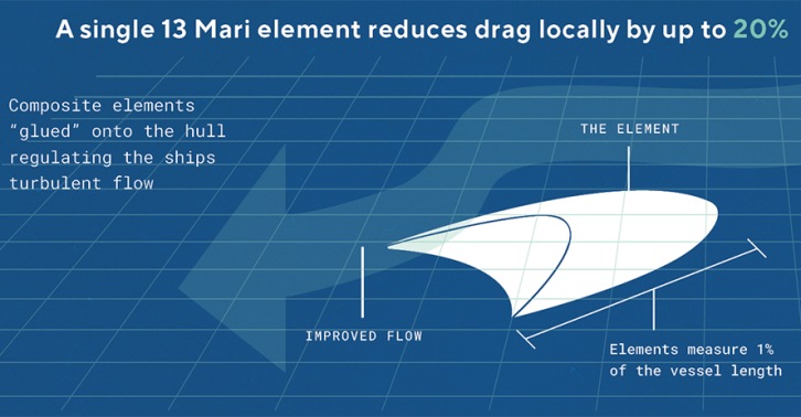 The ripple-shaped Flowsmart element developed by 13 Mari uses technology, which has been incorporated into the shape of aircraft wings and as aero parts for automobiles, and it is based on the concept of controlling the flow of water near the hull to reduce drag and bring out the original performance of the vessel. The company aims to improve the fuel efficiency of vessels and achieve stable navigation.