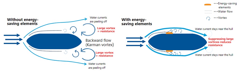 (Note 2) "Ripple-shaped Flowsmart elements": A device to improve propulsion efficiency by preventing the generation of larger vortices, which cause increased drag, by attaching element protrusions to a vessel and forcibly generating small vortices in the surrounding water flow. Due to the turbulence of the water flow around the hull and the underdevelopment of effective simulation technology, it has been difficult to benefit from the drag reduction effect of installing protrusions on vessels and to measure the effect of such protrusions. On the other hand, 13 Mari hypothesized that based on the latest research theories of in the field of fluid mechanics, even on large vessels, the shape, size, degree of interference, and direction of diffusion of vortices can be controlled depending on the location of the energy-saving Ripple-shaped Flowsmart elements, and resistance will be reduced. The company is conducting research and development to elucidate its principle and to put it to practical use.