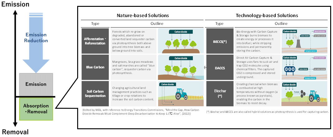 Under the MoU, MOL and KEPCO will conduct research in Africa, Southeast Asia, and other regions on the feasibility and economics of project that generates carbon credits by removing CO2 from the atmosphere (carbon removal credit* generation project), aiming to contribute to address climate change and realize a sustainable society. The MOL Group has set the target of achieving net zero GHG emissions by 2050 in the "MOL Group Environmental Vision 2.2." The group is pursuing a business to generate carbon removal credits and achieve the milestone of "contributing to the removal of a cumulative 2.2 million tons of CO2 by 2030." Based on the Zero Carbon Roadmap, the KEPCO Group is pursuing zero carbon initiatives not only in its own business activities but also in society as a whole. In addition, the group aims to independently conduct its own carbon credit businesses, from generation to sales and trading. MOL and KEPCO previously formed a business alliance for the design of liquefied CO2 carriers in the CCS field and have been jointly studying the design of liquefied hydrogen carriers. [Announced on November 14, 2023, and November 19, 2024] Both companies will continue working toward the realization of a zero-carbon society based on the knowledge and expertise gained through these initiatives. * Carbon removal credits are carbon credits based on the direct removal of CO2 from the atmosphere. The methods are broadly classified into "Nature-based Solutions" and "Technology-based Solutions. Nature- based Solutions include afforestation, reforestation, and soil carbon sequestration, while Technology-based Solutions include DACCS, which directly captures CO2 from the atmosphere and storages it underground, and BECCS, which combines biomass power generation with CCS technology for geological storage of CO2. Objective Consideration of collaboration in joint development of removal credit generation project Scope The following items will be considered for collaboration: (1) Proposal of project to generate carbon removal credits (2) Review of the project feasibility and economic viability to generate carbon removal credits (3) Evaluation of project developers and operators (4) Participation in project to generate carbon removal credits (5) Off-take of removal credits Conceptual diagram of removal credits (Example) Main methods of generating carbon removal credits