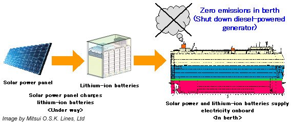 • The company will develop a hybrid power supply system by combining solar power generation technology with lithium-ion batteries. The goal is zero emission while the vessel is in berth by effective use of renewable energy. Electricity generated by solar panels while the vessel is under way is stored in the lithium-ion batteries. The batteries then supply power while the vessel is in berth, allowing the diesel generator to be shut down.
