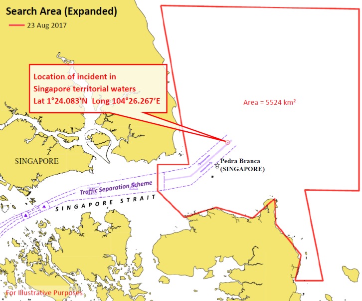 Singapore ceased recovery operations after all 10 missing US Navy crew are accounted for 28 August 2017 1. With the announcement by the US Navy that all 10 missing crew had been recovered from within USS JOHN S MCCAIN, recovery efforts on the vessel have ceased. 2. Following the collision between USS JOHN S MCCAIN and ALNIC MC in Singapore waters on 21 August 2017, Singapore co-ordinated a search and rescue operation with the United States, Australia, Indonesia and Malaysia which covered 5524 km2 and involved more than 300 personnel from Singapore agencies including the Maritime and Port Authority of Singapore (MPA) and the Singapore Armed Forces (SAF), Singapore Police Coast Guard (PCG) and Singapore Civil Defence Force (SCDF). The Singapore-led search and rescue operation was suspended at 2100 hours on 24 August after the US Navy announced its suspension of search and rescue efforts to focus on recovery on USS JOHN S MCCAIN. Singapore continued to support the US Navy in their search on the vessel at Changi Naval Base until all missing crew were accounted for. 3. Mr Andrew Tan, Chief Executive of MPA, said, "On behalf of all agencies involved in this search and rescue operation, MPA expresses our deepest condolences to the families and loved ones of the deceased US Navy crew. We hope they will find the strength to overcome this difficult time." Update 4 - Collision of US Guided-missile Destroyer USS JOHN S MCCAIN and Tanker ALNIC MC in Singapore Waters Search and rescue operations suspended, recovery efforts to focus on US vessel 24 August 2017 1. With the announcement by the US Navy to focus on search and recovery efforts on USS JOHN S MCCAIN for the missing sailors, Singapore has decided to suspend the multi-agency search and rescue operation from 2100 hrs on 24 August 2017. Singapore will continue to support the US Navy in their search on USS JOHN S MCCAIN. 2. The Singapore-coordinated search and rescue efforts with the US, Indonesia, Malaysia and Australia covered 5524 km2 and involved more than 300 personnel from various Singapore agencies over the past four days. 3. Mr Andrew Tan, Chief Executive of Maritime and Port Authority of Singapore (MPA) said, “As the co-ordinating agency for the four-day search and rescue efforts, MPA thanks all personnel from participating nations who worked tirelessly with the Singapore agencies to assist the US Navy. We would like to express our condolences to the families and loved ones of the deceased US Navy crew, and wish the injured crew speedy recovery.” Update 3 - Collision of US Guided-missile Destroyer USS JOHN S MCCAIN and Tanker ALNIC MC in Singapore Waters Search and rescue operations continue with expanded search area 23 August 2017 1. Multi-agency search and rescue (SAR) efforts led by Singapore continued today to locate the remaining unaccounted crew of USS JOHN S MCCAIN which was involved in a collision with tanker ALNIC MC in Singapore waters on 21 August 2017. 2. Today, Republic of Singapore Navy (RSN) patrol vessels RSS FREEDOM and RSS FEARLESS were deployed. Singapore Police Coast Guard (PCG) also deployed two vessels. To cover a wider search area, Republic of Singapore Air Force (RSAF) deployed one Fokker 50 and one C-130, and had one Super Puma on standby. Australia joined today’s operation with a P3 aircraft. Maritime and Port Authority (MPA), as the co-ordinating agency for the SAR efforts, has a craft on scene. 3. The search area covered by the Singapore-led SAR efforts was further expanded to 5524 km2 today from 2620 km2 yesterday. In the coordinated search efforts with the US, Indonesia, Malaysia and Australia, Singapore and the US are covering the Central sector of the search area. Malaysia, Australia and Indonesia are covering the North-west, North-east and Southern sectors respectively. Please refer to Annex 1. 4. The US Navy and Marine Corps divers located some remains when they accessed sealed compartments in the damaged parts of the ship during their search operations yesterday. Diving operations in the US vessel are currently still ongoing. 5. In total, more than 300 personnel from Singapore were deployed for this operation. The Singapore Armed Forces (SAF) has deployed four patrol vessels, three fast craft, one frigate, three Super Pumas, two Chinooks, two C-130 and three Fokker 50 while PCG deployed four patrol craft. MPA deployed two craft, three tugboats and a team of divers. In addition, MPA has been issuing hourly navigational broadcasts to advise passing vessels of the incident and requested them to keep a lookout for any persons in the water. Annex 1 — Search Area