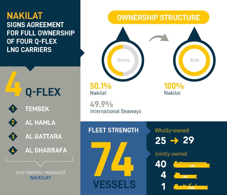 7 October 2019 Nakilat has today acquired the full ownership of four Q-Flex liquefied natural gas (LNG) carriers from its joint-venture partner, International Seaways, Inc. (“INSW”) following execution of a sale and purchase agreement for the acquisition of the remaining 49.9% ownership interest in these vessels from INSW. This brings the total number of vessels wholly-owned by Nakilat from 25 to 29 LNG vessels, out of its overall fleet of 74 LNG and liquefied petroleum gas (LPG) vessels. With a cargo carrying capacity of 217,000cbm each, the four LNG carriers have been operated and managed in-house by Nakilat’s ship management arm, Nakilat Shipping Qatar Limited (NSQL), since 2014. This is in addition to the other 10 LNG and 4 LPG carriers under NSQL management. Chief Executive Officer of Nakilat, Eng. Abdullah Al Sulaiti, said: “The 100% ownership acquisition of these four vessels comes as part of Nakilat’s long-term strategy to capitalize on such strategic investment opportunities. These vessels are chartered to our long-standing partner Qatargas, the world’s largest exporter of clean energy. Owning the vessels that we manage allows Nakilat to consolidate its fleet, provides greater operational flexibility and optimization of resources, leading to the realization of cost savings with minimal risks and strengthens our customer focus. In addition, this transaction affirms the strong financial standing of the company and our commitment to maximize value for our shareholders, in alignment with our vision to be a global leader and provider of choice for energy transportation and maritime services.” Nakilat’s LNG shipping fleet is among the largest in the world, comprising of 14 Q-Max, 31 Q-Flex and 24 conventional vessels (includes four newbuilds). The company also owns 4 liquefied petroleum gas (LPG) and one Floating Storage Regasification Unit (FSRU) as part of its fleet.
