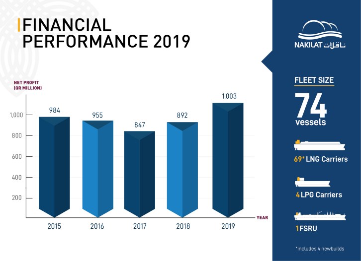 H.E. Dr. Mohammed Bin Saleh Al Sada, Chairman of Nakilat’s Board of Directors said: “This past year unfolded many noteworthy accomplishments; hence the Board would like to begin by commending Nakilat for its persistence in pushing the boundaries towards the achievement of its vision. Nakilat has come a long way in its brief 15-year operating history to become a formidable global shipping and maritime company. Bolstered by more favourable market conditions and our own implementation of business diversification and resource optimization strategies, we have stayed true to our mission to create value for our shareholders while elevating the business to new heights.” Eng. Abdullah Fadhalah Al Sulaiti, Chief Executive Officer (CEO) of Nakilat said: “The result of our efforts is clearly tangible from our stellar financial performance in 2019, thanks to our employees and seafarers’ valuable efforts and contributions towards this accomplishment. The company continued its impressive momentum of growth and expansion across all fronts, in preparation for additional shipping capacity to meet the growing international demand for clean energy. Nakilat persevered and emerged even stronger, pursuing operational excellence, diversifying portfolios, solidifying internal capabilities, strengthening international presence and aggressively implement strategic long-term growth strategies. We would also like to extend our appreciation to Qatar Petroleum for its support, as well as strategic partner Qatargas in playing a significant role to ensure our robust financial performance. Such synergies help drive the company’s vision to be a global leader and provider of choice for energy transportation and maritime services”.