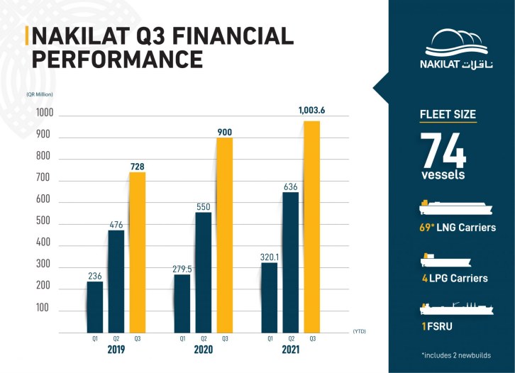 17 October 2021 Nakilat announced its financial results for the third quarter ended September 30, 2021, reporting a net profit of QR 1,003.6 million. This is a 11.5% year on year increase compared to the net profit of QR 900 million reported during the same period in 2020. Key financial highlights from the third quarter of 2021 include: • Revenue of QAR 3,071 million, increase by 0.2% • General and administrative expenses decreased by 4.8% • Operating expenses decreased by 0.9% The shipping and maritime company's solid earnings results are primarily attributed to the implementation of the company's strategic initiatives across all levels, driven by the company's growth strategy and cost optimization. The close alignment with Qatar National Vision 2030, which aims to create a sustainable future for the country, is championed by the Board of Directors. Nakilat has been diversifying its portfolio and expanding international outreach in response to the greater global demand for clean energy. The company is continuously expanding its shipping management capabilities with the latest addition of technologically advanced LNG carrier newbuilds, a key factor in its success and testament to an unwavering commitment to excellence. In 2021, Nakilat's fleet has stands at 74 vessels, just under 12% of the current global LNG fleet, bearing testament to the company's strong shipping management capabilities. Eng. Abdullah Al Sulaiti, Chief Executive Officer at Nakilat said: "Our team continues to demonstrate exceptional agility and resilience, as reflected in our operational and financial performance for the year. Our robust financial performance over the last 9 months is testament to the concerted effort of every employee and seafarer on our team. It is only through their continued support that we have remained persistent in executing our strategies, sustaining operational efficiencies, and ensured fiscal discipline across all our shipping and maritime operations. We are continually assessing new opportunities and emerging risks. Our agile ways of working allow us to tactfully navigate the market as we steer forward as the provider of choice for energy transportation and maritime services. It is this approach that has not only allowed us to persevere as a company, but also create growth for our shareholders." Nakilat's Board of Directors expressed their appreciation to Qatar Energy (QE) for its ongoing support, and the company's strategic partner Qatargas, for playing a significant role in the robust performance.