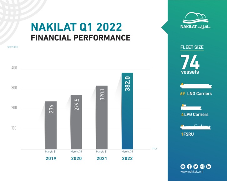 Doha, Qatar - 17 April 2022 Nakilat, the world's largest Liquefied Natural Gas (LNG) fleet operator achieved a net profit of QR 382 million for the first quarter ended March 31, 2022, compared to QR 320.1 million during the same period in 2021, an increase of 19.3%. Despite the global challenges posed by the COVID-19 pandemic, Nakilat continues to deliver uninterrupted clean energy to the world, through safe, reliable, and efficient shipping and maritime services. The company also continues to strengthen its value proposition, by offering ship repair, industrial and offshore fabrication, towage, and other maritime services. Eng. Abdullah Al Sulaiti, Chief Executive Officer, Nakilat, said: "We are very pleased to report a stellar earnings result for the first quarter 2022, which reiterates the resilient business model that Nakilat has built over the years. Against the current backdrop of global economic environment and the long-term needs for diversified, secure and reliable energy transportation solutions, Nakilat shall continue to grow its assets portfolio and generate sustainable return for its shareholders." As a testament to the company's commitment to health and safety, Nakilat recently attained a five-star grading in the Five Star Occupational Health and Safety Audit, for the fifth consecutive year. Conducted by the British Safety Council, the Audit provides a worldwide benchmark of organizational safety management systems against current best practice. Al Sulaiti said: "I would like to take this opportunity to extend our deep appreciation to QatarEnergy, QatarEnergy Industrial Cities, Qatargas, and all our staff for their ongoing support and collaboration, in ensuring our success and the realization of our vision of becoming a global leader and provider of choice for energy transportation and maritime services." Nakilat will host an investor relations conference call on its financial results for the first quarter of 2022. The conference call will be held on 18 April 2022, at 13:30 (Doha Time), and the presentation will be made available on the company's website prior to the call.