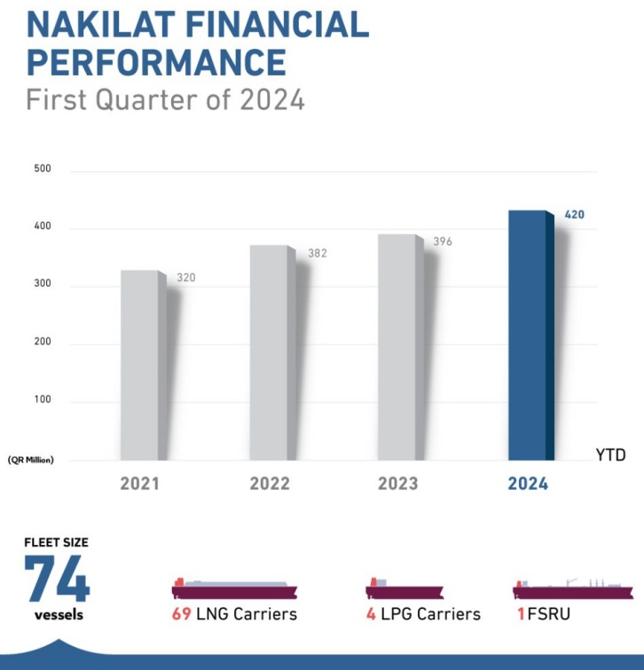 Eng. Abdullah Al-Sulaiti, CEO of Nakilat, emphasized the company's strategic approach to these factors: "Despite uncertain economic outlook and high interest environment, we have remained committed to reliable and safe global operations, continuing to deliver clean energy to +40 countries and about 100 terminals across continents. Throughout two decades of operations, we have been meeting the world's demand for LNG, as a dependable partner. Our latest financial results, reflected by an increase in net profit by 6.1%, is testament to the resilience of the company, its innovative solutions, and its operational efficiency". As per the company's latest announcement in February 2024, Nakilat was awarded long-term contracts and selected as the full owner and operator of up to 25 LNG carriers by QatarEnergy, marking a significant milestone in its fleet expansion project aimed at meeting future LNG production demands. Furthermore, earlier in January 2024, Nakilat has also announced a shipping expansion through vessel acquisition. The Company placed orders for the construction of six gas vessels: two cutting-edge LNG carriers and four modern very large LPG/ammonia carriers. Upon the delivery of the new vessels, the addition to Nakilat's ever-expanding fleet not only signifies an increase in capacity and flexibility for its esteemed customers, but also reinforces the company's pioneering role in the energy transportation sector. The Company Board of Directors would like to take this opportunity to extend its appreciation to QatarEnergy, QatarEnergy LNG, and all staff for their ongoing support and collaboration, in being the drivers of our success and leading the Company to its vision of becoming a global leader and provider of choice for energy transportation and maritime services. In line with commitment to providing the best practices in investor relations and its strategy to engage shareholders and investors, the Company will hold an investor relations conference call to discuss the financial results for the first quarter of 2024: on Monday, 29 April 2024 at 01:30 pm (Doha time). The conference presentation will be published on the Company's website prior to the conference call. For further information on conference call dial-in details, please visit the company's website www.nakilat.com.