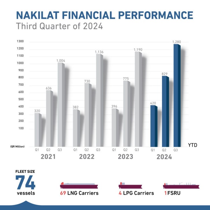 Doha, Qatar - October 20, 2024: Qatar Gas Transport Company Q.P.S.C. (Nakilat), a global leader in the shipping and maritime sector, announces its financial results for the third quarter of 2024 ended 30 September 2024.The company achieved a net profit of QAR 1.28 billion. This represents an increase of 7.2% compared to the same period in 2023, showcasing Nakilat's ability to achieve sustained growth amidst dynamic global market conditions. Nakilat continues to strengthen its position as one of the world's largest LNG fleet owners through strategic partnerships, fleet modernization, and achieving operational excellence. Its growth strategy is anchored in a strong commitment to safety, sustainability, and delivering reliable energy transportation solutions. Recently recognized on Forbes Middle East's Top CEOs list, the company remains a prominent leader in the industry, further enhancing its reputation for innovation and excellence. Eng. Abdullah Al-Sulaiti, Chief Executive Officer of Nakilat, stated: "Nakilat's strong performance this quarter reflects our ongoing efforts to enhance operational efficiency. As the global demand for clean energy transportation continues to grow, we remain committed to driving innovation and pursuing long-term growth. Our expansion projects, coupled with our dedication to sustainability, safety, customer-centricity and the highest industry standards, have enabled us to maintain our leadership in the maritime industry. I would like to extend my appreciation to the team at Nakilat for their tremendous efforts in preparing for the implementation of the new fleet construction, which is considered the world's largest program for building LNG vessels for a single owner." The company continues to progress with its construction of advanced LNG and LPG/Ammonia carriers, scheduled for delivery in the coming years. These new vessels, along with Nakilat's strategic long-term contracts, position the company to meet the growing global energy demands while increasing fleet efficiency. Upon completion of the delivery of all the vessels, Nakilat's fleet will expand to 114 vessels, further reinforcing its leadership in the global clean energy transportation market. In line with commitment to providing the best practices in investor relations and its strategy to engage shareholders and investors, the Company will hold an investor relations conference call to discuss the financial results for the third quarter of 2024 on Monday, 21 October 2024, at 13:30 hours (Doha Time). The conference presentation will be published on the Company's website prior to the conference call. For further information on Nakilat's conference dial-in information, please visit ww.nakilat.com.