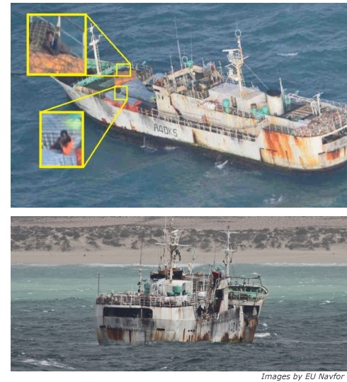 On Saturday 27 July, a helicopter from an EU Naval Force warship overflew the pirate controlled fishing vessel Naham 3 and was able to confirm that the fishing vessel had become detached from the sunken MV Albedo and was steaming north along the Somali coast under her own power.