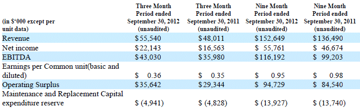 Three month periods ended September 30, 2012 and 2011 Time charter revenues for the three month period ended September 30, 2012 increased by $7.5 million or 15.6% to $55.5 million, as compared to $48.0 million for the same period in 2011. The increase was mainly attributable to the acquisition of the Navios Buena Ventura on June 15, 2012, the acquisition of the Navios Soleil on July 24, 2012 and the acquisition of the Navios Helios on July 27, 2012. As a result of these vessel acquisitions, available days of the fleet increased to 1,882 days for the three month period ended September 30, 2012, as compared to 1,656 days for the three month period ended September 30, 2011. The time charter equivalent (“TCE”) increased to $29,341 for the three month period ended September 30, 2012, from $28,992 for the three month period ended September 30, 2011. EBITDA increased by $7.0 million to $43.0 million for the three month period ended September 30, 2012, as compared to $36.0 million for the same period of 2011. The increase in EBITDA was due mainly to a $7.5 million increase in revenue following the acquisition of the Navios Buena Ventura on June 15, 2012, the acquisition of the Navios Soleil on July 24, 2012 and the acquisition of the Navios Helios on July 27, 2012, a $0.7 million decrease in time charter expenses and a $0.3 million increase in other income/(expense), net. The above increase was partially offset by a $1.4 million increase in management fees and a $0.1 million increase in general and administrative expenses. The reserve for estimated maintenance and replacement capital expenditures for the three month periods ended September 30, 2012 and 2011 was $4.9 million and $4.8 million, respectively (please see Reconciliation of Non- GAAP Financial Measures in Exhibit 3). Navios Partners generated an Operating Surplus for the three month period ended September 30, 2012 of $35.6 million, as compared to $29.3 million for the three month period ended September 30, 2011. Operating Surplus is a non-GAAP financial measure used by certain investors to assist in evaluating a partnership’s ability to make quarterly cash distributions (please see Reconciliation of Non-GAAP Financial Measures in Exhibit 3). Net income for the three months ended September 30, 2012 amounted to $22.1 million compared to $16.6 million for the three months ended September 30, 2011. The increase in net income by $5.5 million was due to a $7.0 million increase in EBITDA partially offset by: (i) a $1.3 million increase in depreciation and amortization expense due to the acquisition of the Navios Buena Ventura, and the favorable lease terms recognized in relation to this acquisition and the acquisition of the Navios Soleil and the Navios Helios; and (ii) a $0.1 million decrease in interest income. Nine month periods ended September 30, 2012 and 2011 Time charter revenues for the nine month period ended September 30, 2012 increased by $16.1 million or 11.8% to $152.6 million, as compared to $136.5 million for the same period in 2011. The increase was mainly attributable to the acquisitions of the Navios Luz and the Navios Orbiter on May 19, 2011, the acquisition of the Navios Buena Ventura on June 15, 2012, the acquisition of the Navios Soleil on July 24, 2012 and the acquisition of the Navios Helios on July 27, 2012. As a result of these vessel acquisitions, available days of the fleet increased to 5,088 days for the nine month period ended September 30, 2012, as compared to 4,604 days for the nine month period ended September 30, 2011. TCE increased to $29,513 for the nine month period ended September 30, 2012, from $29,646 for the nine month period ended September 30, 2011. EBITDA increased by $17.0 million to $116.2 million for the nine month period ended September 30, 2012, as compared to $99.2 million for the same period of 2011. The increase in EBITDA was mainly due to: (i) a $16.1 million increase in revenue following the acquisitions of the five vessels at various times until July 2012 the Navios Luz, the Navios Orbiter, the Navios Buena Ventura, the Navios Soleil and the Navios Helios; (ii) a $4.0 million of non-cash charge for the write-off of intangible asset associated with the Navios Apollon charter out contract incurred in the nine month period ended September 30, 2011; and (iii) a $0.8 million increase in other income/ (expense), net. The above increase was partially offset by a $3.4 million increase in management fees, a $0.3 million increase in general and administrative expenses and a $0.2 million increase in time charter expenses. The reserve for estimated maintenance and replacement capital expenditures for the nine month periods ended September 30, 2012 and 2011 was $13.9 million and $13.7 million, respectively (please see Reconciliation of Non- GAAP Financial Measures in Exhibit 3). Navios Partners generated an Operating Surplus for the nine month period ended September 30, 2012 of $94.7 million, as compared to $84.5 million for the nine month period ended September 30, 2011. Operating Surplus is a non-GAAP financial measure used by certain investors to assist in evaluating a partnership’s ability to make quarterly cash distributions (please see Reconciliation of Non-GAAP Financial Measures in Exhibit 3). Net income for the nine months ended September 30, 2012 amounted to $55.8 million compared to $46.7 million for the nine months ended September 30, 2011. The increase in net income by $9.1 million was due to a $17.0 million increase in EBITDA partially offset by: (i) a $6.1 million increase in depreciation and amortization expense due to the acquisitions of the Navios Orbiter, the Navios Luz and the Buena Ventura and the favorable lease terms recognized in relation to these acquisitions and the acquisitions of the Navios Soleil and the Navios Helios; (ii) a $1.2 million increase in interest expense and finance cost, net; and (iii) a $0.6 million decrease in interest income. About Navios Maritime 