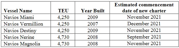 Monaco - June 15, 2021 Navios Maritime Partners L.P. (“Navios Partners”) (NYSE: NMM), an international owner and operator of dry cargo vessels, announced today that it has secured new long-term time charters for five containerships. The containerships have been chartered-out for 35 - 36 months at an average rate of approximately $41,723 net per day. The charters have the following structure: The first year is chartered-out at $54,313 net per day, the second year at $45,425 net per day and the remaining 11 months of the minimum period at $23,972 net per day. The charters will commence upon expiration of the current employment of the vessels. The table below sets out the vessel details and the expected commencement date of the new charters: