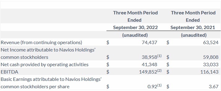 Angeliki Frangou, Chairwoman and Chief Executive Officer, stated, "I am pleased with the results of the third quarter, during which we reported Net Income of $39.0 million." Angeliki Frangou, continued, "Because of the renewed global focus on food and energy security, we believe there is a significant commercial opportunity in the Hidrovia region. As a result of this interest, we are focused on growing our regional infrastructure and related logistics assets. We have also implemented our management succession plan. George Achniotis has been appointed as Chief Executive Officer while Ioannis Karyotis and Enrique Ferrando, have been promoted to Chief Operating Officer and Chief Financial Officer, respectively. Claudio Lopez will continue to provide his leadership and experience in his role as Vice Chairman." Highlights Completion of Tender Offer for the Company's Series G and H Preferred Stock As of the completion of the Company's tender offer on October 21, 2022, a total of 20,185 Series G American Depositary Shares ("Series G ADSs") were validly tendered for a total of $0.3 million in cash consideration and a total of 584,158 Series H American Depositary Shares ("Series H ADSs") were validly tendered for a total of $8.9 million in cash consideration. Following the tender offer, Navios Holdings has 514,720 outstanding Series G ADSs and 1,183,944 outstanding Series H ADSs, which represent 1/100th of a share of 8.75% Series G Cumulative Redeemable Perpetual Preferred Stock (the "Series G Preferred Stock") and 1/100th of a Share of 8.625% Series H Cumulative Redeemable Perpetual Preferred Stock (the "Series H Preferred Stock"), respectively. Management Succession for Logistics Business George Achniotis, Chief Financial Officer of Navios Holdings, has been appointed as the new Chief Executive Officer of Navios Logistics. Other changes on the executive team include the promotions of Ioannis Karyotis as Chief Operating Officer, Enrique Ferrando as Chief Financial Officer and Mariana Rebolo as Chief Risk Officer as well as changes in the commercial and business development teams. Completion of the sale of 36-Vessel Dry Bulk Fleet In September 2022, the sale of our 36-vessel drybulk fleet ("the Transaction") was completed. The closing of the Transaction was effected in two tranches. The first tranche, involving the transfer of 15 vessels, was completed on July 29, 2022. The second tranche, involving the remaining 21 vessels, was completed on September 8, 2022. Following the closing of the Transaction, the results of the dry-bulk vessel operations have been reported as discontinued operations for all periods presented. Non-GAAP Measures EBITDA attributable to Navios Holdings' common stockholders and EBITDA of Navios Logistics (on a stand-alone basis) are non-U.S. GAAP financial measures and should not be used in isolation or as a substitute for results calculated in accordance with U.S. GAAP. See Exhibit I under the heading, "Disclosure of Non-GAAP Financial Measures," for a discussion of Navios Holdings' consolidated EBITDA and EBITDA of Navios Logistics (on a stand-alone basis) and a reconciliation of such measures to the most comparable measures calculated under U.S. GAAP. Earnings Highlights Third Quarter 2022 and 2021 Results (in thousands of U.S. dollars, except per share data and unless otherwise stated): The third quarter 2022 and 2021 information presented below was derived from the unaudited condensed consolidated financial statements for the respective periods.