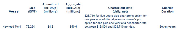 The "Newlead Tomi" is one of the two geared Kamsarmaxes that NewLead is building at Cosco Dalian Shipyard Co. The second Kamsarmax vessel is expected to be delivered in the fourth quarter of 2011.
