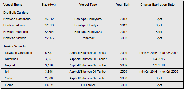 1. Third party vessel under management About NewLead Holdings Ltd. NewLead Holdings Ltd. is an international vertically integrated shipping, logistics and commodity company providing ideal solutions for seaborne transportation of dry bulk commodities and petroleum products through owned and managed vessels. NewLead controls a fleet of nine vessels, including four dry bulk and five tanker vessels and manages one third party tanker vessel. NewLead is a Securities and Exchange Commission ("SEC") reporting Foreign Private Issuer in compliance with applicable SEC rules and regulations and current in its SEC reporting, utilizing U.S. Generally Accepted Accounting Principles' financial reporting standards. NewLead's common shares are traded under the symbol "NEWL" on the OTC Pink Current marketplace. To learn more about NewLead Holdings Ltd., please visit NewLead's website at www.newleadholdings.com. NewLead Holdings Ltd. press release
