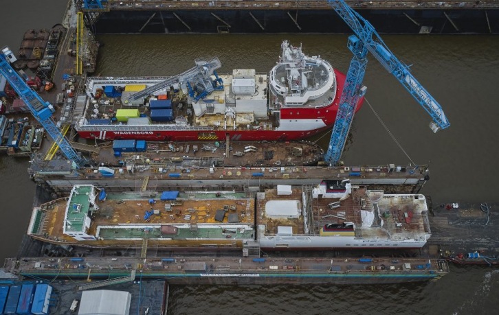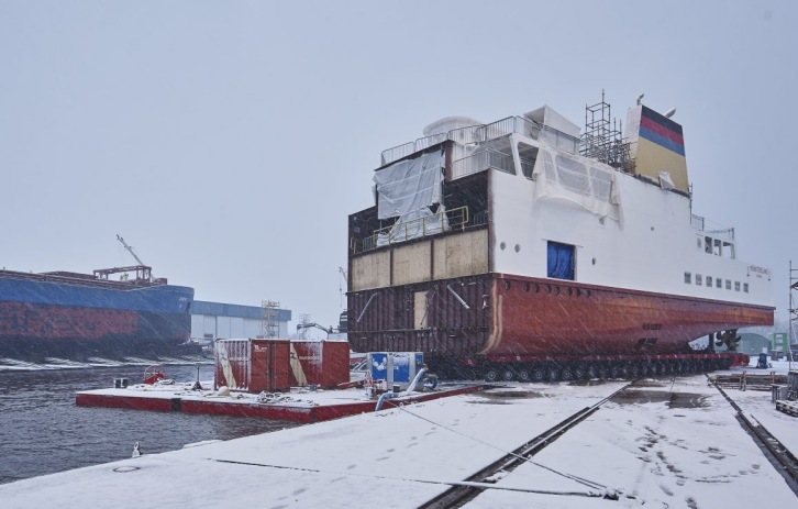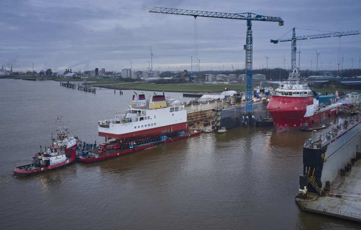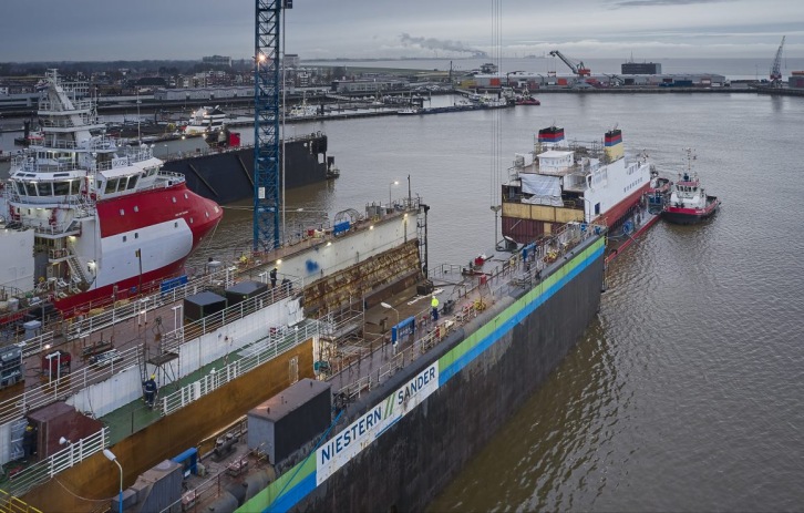 29 January 2021 Last Thursday, the Royal Niestern Sander shipyard installed a new aft ship on the passenger ship Münsterland. This completely newly designed and built aft ship contains dual fuel engines, an LNG storage tank, propulsion, all LNG installations, pipes and other systems. In the coming period, the new aft ship will be welded to the existing ship. Earlier this week, the old aft ship was removed and transported on a pontoon to Groningen for recycling. With the same pontoon, the aft ship – built by the shipbuilding department of the yard – was transported from the inner-dike location to the dock location. On arrival at the dock, the new stern with modular trailers was driven from the pontoon into the dock and placed in position behind the Münsterland. Ship building and ship repair Niestern Sander’s project approach is based on the two pillars of the company, namely shipbuilding and ship repair. Due to the combination of new shipbuilding and ship repair, the majority of the conversion operation takes place physically at the shipbuilding yard, where the repair dock is not yet necessary. During these activities, the Münsterland can still remain in service. Green As a result of the LNG conversion, the Münsterland will use a less polluting fuel, which greatly reduces emissions. The new shape of the stern will also reduce the hull resistance. As a result, the ship has less engine power to be able to sail at the same speed, which means a reduction in fuel consumption and noise. Feasibility With the Münsterland, Royal Niestern Sander has the opportunity to demonstrate the economic feasibility of an LNG conversion in practice thanks to its unique conversion method. It will also appear that the space limitation when converting an existing ship can be solved. The Münsterland will be put back into service in its new form by AG Ems in the summer of 2021. For this innovation process, Niestern Sander will receive a contribution from the European Fund for Regional Development of the European Union.