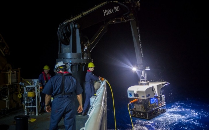 Two new ships to be built for NOAA will greatly enhance the agency’s ocean exploration and scientific research capabilities. In this photo, a remotely operated vehicle is brought aboard NOAA Ship Okeanos Explorer. Image by NOAA. NOAA press release