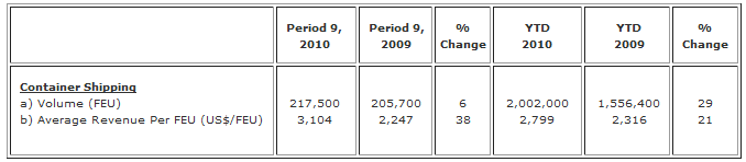 For the four weeks of P9 2010, container shipping volumes increased 6% over the same period last year mainly due to higher volumes carried on the Transpacific and Asia Europe trade lanes. Average revenue per FEU (Forty-foot Equivalent Unit) was 38% above the same period last year, due to improved freight rates in the major trade lanes and peak season surcharges.