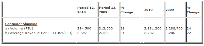 January 31, 2011: NOL’s container shipping operating performance metrics for the