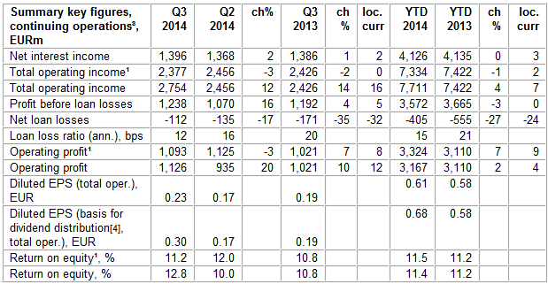 Exchange rates used for Q3 2014 for income statement items are for DKK 7.46, NOK 8.28 and SEK 9.04, see also Note 1. Net impact from currency fluctuations between Q3 2014 and Q2 2014 was insignificant. 1) Excluding non-recurring income and cost items in Q3 2014 of pre-tax EUR +34m net and restructuring costs in Q2 2014 of EUR 190m. 2) Previously estimated Basel III CET1 ratio. 3) Key figures for continuing operations, following the divestment of the Polish banking, financing and life insurance operations. 4) Diluted EPS, basis for dividend distribution, is excluding impairment of intangible assets in Q3 2014. Nordea, press release |