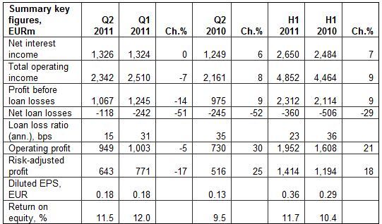 At the same time, the trading result decreased from last quarter's high levels due to volatility in the financial markets and interest income was affected by increased and prolonged funding. Nordea's relationship strategy has laid a solid foundation for our New Normal ambition to reach an ROE in the top league of European banks of around 15%. In the autumn, we will continue to improve capital efficiency and implement plans to contain cost growth in the later part of 2011, and thereafter keep costs largely unchanged for a prolonged period of time." First half year 2011 vs first half year 2010 (second quarter 2011 vs first quarter 2011): • Total income up 9% (down 7%) • Number of Gold and Private Banking customers up 183,000 or 6% (up 40,000 in the second quarter, a 5% growth rate) • Net loan losses 17 basis points excluding the Danish deposit guarantee fund provision, down from 36 bps last year (12 bps in second quarter down from 22 bps in first quarter) • Operating profit up 21% (down 5%) • Core tier 1 capital ratio 11.0% excluding transition rules, up from 10.0% one year ago (up from 10.7% in the first quarter 2011) • Return on equity 11.7%, up from 10.4% in first half year 2010 (11.5% in the second quarter 2011, down from 12.0% in the first quarter 2011)