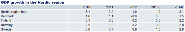 Despite solid public finances and underlying strong competitiveness the Nordic economies could not escape the fallout from the weak economic performance in the Euro zone in 2012; they all started the new year on a weaker note. But the brighter international outlook will also lighten the situation in the Nordic countries in the years ahead when exports should gain momentum again. Amid an increasing unemployment rate Swedish households are still doing well and are expected to be the main growth engine during the forecast horizon. The Riksbank argues that its monetary policy line is already expansionary and focuses on the emerging signs of improvement in the economy. Further rate cuts are therefore not in our forecast. Next year the repo rate will be hiked as the economy strengthens further. Also in Norway the economic outlook for the next two years is largely good. Consumption growth will likely pick up again, housing and oil investment will continue to grow and public demand will increase moderately. As Norges Bank will only slowly raise its policy rate, the NOK is unlikely to firm significantly during the forecast period; towards the end we may even see some weakening. Denmark is close to a new technical recession, but the government’s reform policy has laid the groundwork for the Danish economy being well positioned to benefit once the international cycle improves again. Denmark’s competitiveness is fundamentally good, and at one point the batch of short-term measures to boost consumer spending and investment activity will feed through. The outlook for the Finnish economy is still gloomy. There are no obvious growth drivers in the very near term, but some hope that exports may pick up later in the year, while imports should remain weak due to subdued domestic demand. Investment activity is still lacklustre and consumer spending is expected to rise only slightly in the coming years when falling employment and higher taxes will limit households’ purchasing power.