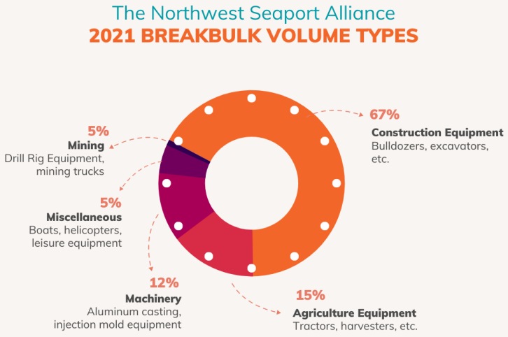 Handling 366,184 metric tons of breakbulk cargo, 2021 boasted highest breakbulk volumes in NWSA history. Seattle + Tacoma - January 31, 2022 2021 marks the highest breakbulk cargo volumes for The Northwest Seaport Alliance (NWSA) gateway. Since 2015, the NWSA has operated breakbulk cargo facilities at East Blair 1 and Terminal 7 in Tacoma. "We are proud of our port operated terminals, Port of Tacoma personnel, and the ILWU longshore workforce who has worked diligently to support our record-breaking breakbulk operations," stated Port of Tacoma Commissioner President and NWSA Co-Chair Don Meyer. "Breakbulk cargo such as construction and agriculture equipment supports our diversified economy and numerous jobs across Washington state and the Pacific Northwest." The majority of breakbulk cargo in 2021 was comprised of ro-ro (roll-on, roll-off) cargo with construction equipment making up 67% of the past year's cargo volumes. Additional breakbulk types include agriculture, machinery, and mining equipment. The NWSA team also assists cargo owners in moving miscellaneous goods such as boats, helicopters, and other unique cargo. The surge of breakbulk cargo can be attributed to new customers and carriers calling the NWSA gateway as well as rebounding volumes from covid-impacted operations in 2020. Additionally, high containerized cargo rates have incentivized container cargo shippers to seek creative transportation solutions, utilizing ro-ro. Breakbulk volumes are expected to remain high as increased federal infrastructure funding is driving additional demands for construction equipment to work newly funded infrastructure projects across the country. The NWSA is strategically positioned to excel at moving breakbulk cargo, offering two terminals that handle both breakbulk and auto cargo allowing customers to mix their ro-ro shipments. NWSA is committed to maintaining diversified cargo opportunities for customers to move their goods - both containerized and breakbulk - through the Seattle + Tacoma gateway.