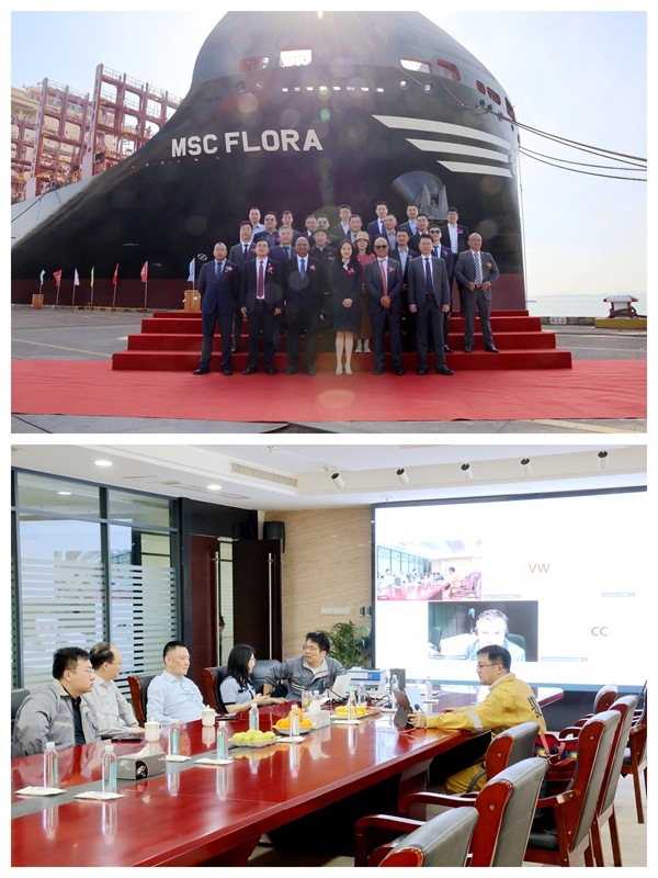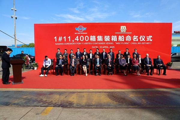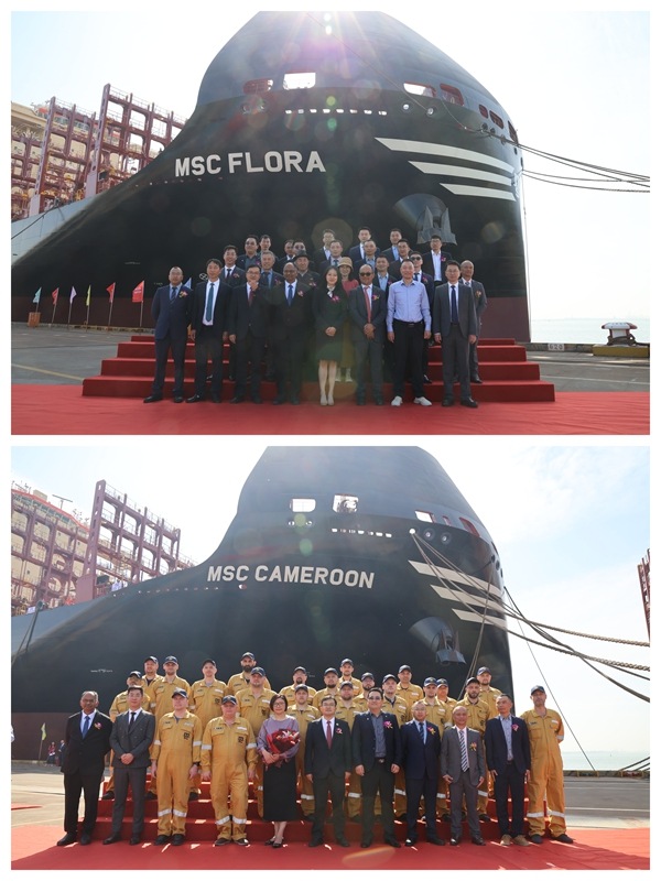 21 April 2025 On 16 April, 2025, we held naming ceremony for two units of 8,100 TEU Container Vessels with Builder's Hull Nos.0208103 and 0208109 together with one unit of 11,400 TEU Container Vessel with Builder's Hull No.0211401. Our Executive Deputy General Manager Mr. Zhang Yuyong, General Manager Assistant Mr. Xu Zhenyu, MSC site manager Mr. Chen Yukun, BV Marine&Offshore China, New Construction Manager Mr. Christophe Vaes,ABS China Central Area General Manager Mr. Song Aimin, LR Deputy PM Mr. Liu Yi and other VIP guests attended this ceremony. Godmother Ms. Song Mengzhen named the vessel 0211401 for "MSC FLORA". Godmother Ms. LI Xiaoqing named the vessel 0208103 for "MSC CAMEROON". Godmother Ms. Yi Gaojie named the vessel 0208109 for "MSC NAMIBIA". On April 16th and 17th, NTS successively signed the delivery documents with MSC for these two 8,100 TEU container vessels.